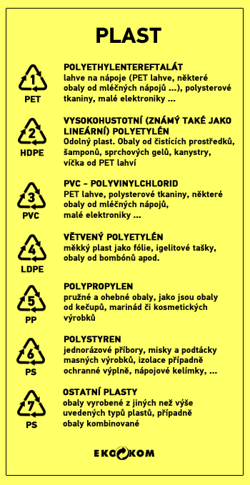 V obchodech nás obklopují tisíce různých výrobků. U těch sledujeme hlavně ceny. Málokdo si na obalech vedle nadpisů, obrázků a barev všimne nenápadných symbolů. Ať je to kelímek od jogurtu,sáček od arašídů nebo krabička od sýra, na všech najdeme symboly, písmena a čisla. Ty napovídají, do kterého kontejneru můžeme obal vytřídit. Nejčastěji na obalech výrobci uvádějí jednoduché zkratky jako PAP nebo GL. Takže je na první pohled jasné, že se jedná o papírový nebo skleněný obal (sklo = GLASS). Složitěji jsou označené plasty. Zkratky jako PET, PP nebo PS přímo označují druh plastu, ze kterého je obal vyroben. Často se taky setkáme s označením ALU (hliník) nebo C/PAP 81. Ty najdeme na hliníkových obalech od sýrů a na nápojových kartonech od džusu nebo mléka.